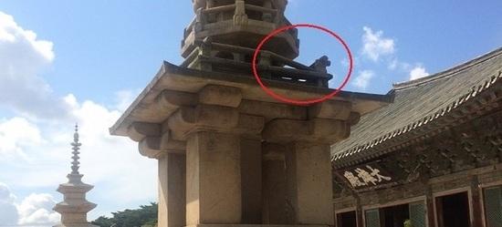 | ▲ 제20호 불국사 다보탑 옥개석 난간석이 일부 파손된 모습 © 김가이 기자 |