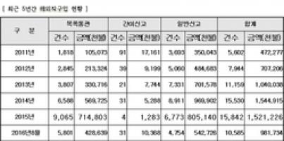연도별로 보면 2011년 134건이었던 마약 해외직구 수는 2015년에는 262건을 기록하하면서 2배가량 증가했다. 이는 전체 해외직구건의 증가추세와 맞물려 있는것으로 실제, 2011년에 5천245억 원이었던 전체 해외직구 규모는 2015년에 1조 7천억 원으로 대폭 증가했다.