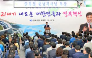 안 지사는 약 50분간의 강연에서 동서축으로서의 경북도-충남도의 역할과 협약 체결의 의미와 21세기 리더쉽, 그리고 정부의 역할 등으로 나누어 공무원들과의 교감을 시도했다.