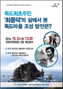 【브레이크뉴스 포항】김가이 기자= 박명재 의원(새누리당 포항남·울릉)은 오는 24일 국회에서 독도최초주민 ‘故 최종덕’씨의 독도에서의 생활을 담은 사진전과 향후 독도마을 조성에 대한 정책방향을 논의하는 학술세미나를 동시에 개최한다고 20일 밝혔다.