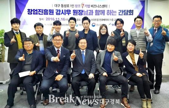 【브레이크뉴스 대구】이성현 기자= 민간 기관인 (주)디지스타트업인큐베이터가 주관 대구 동성로 1인 창조기업 비즈니스센터(본부장 박희광. 이하 센터)에 16일 반가운 손님이 찾아왔다. 창업진흥원 강시우 원장이 찾은 것.