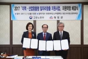 【브레이크뉴스 청도】김상호 기자= 청도군(군수 이승율)은 대경대학교 산학협력단(단장 김옥미), 청도우리정신문화재단(이사장 이승율)과 함께 지난 13일 오후 군수실에서 지역·산업맞춤형 일자리창출사업 선정에 따른 업무협약을 체결했다고 14일 밝혔다.