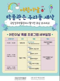 경주박물관에 따르면 ‘어린이날-박물관은 우리들 세상’은 2017년 봄 여행주간과 어린이날에 맞추어 기획된 특별 프로그램으로 5월 5일 어린이날 오후 1시부터 5시까지 영화 상영 및 다채로운 체험 프로그램을 제공한다.