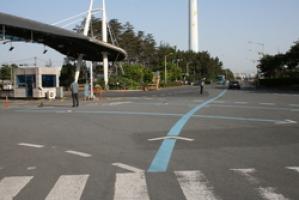 | ▲ 포항제철소가 교통량이 많은 1문 앞 도로에 ‘컬러 차로유도선’을 설치해 제철소 진출입 차량들의 안전을 획기적으로 개선했다. © 포스코 포항제철소 제공 |
