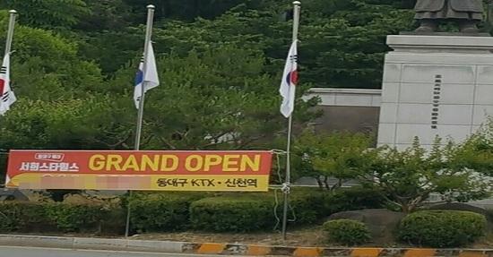 【브레이크뉴스 대구】박영재 기자= 현충일인 6일, 대구시 동구 파군제 삼거리 신숭겸 장군 동상 앞 국기게양대에 서희 스타힐스 분양광고 현수막이 내걸려 있어 뜻있는 시민들의 눈살을 찌푸리게 하고있다.